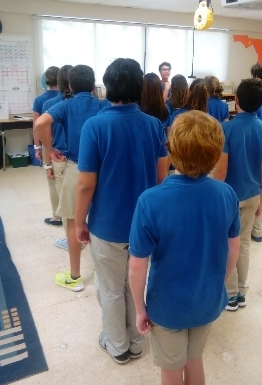 Then, we repeated the above instructions, but this time in formation. Once ready, I then had them take steps forward, marching in unison. This was fun to watch as each student took steps of various stride lengths, causing a few collisions and bumping. Once we had these kinks settled, we tried again to advance together as a group.