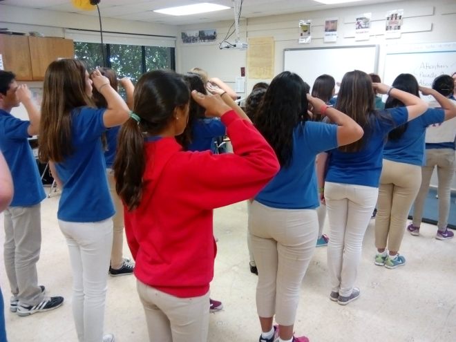 (At this point I have to admit that I was very lucky to have a student in one class who had actually spent time in a military school. They provided amazing support – helping out with the jargon and the actual instructions for how to stand, how to move, etc. If you can, ask to see what students know before beginning. It might save you time and save you from embarrassing yourself!)