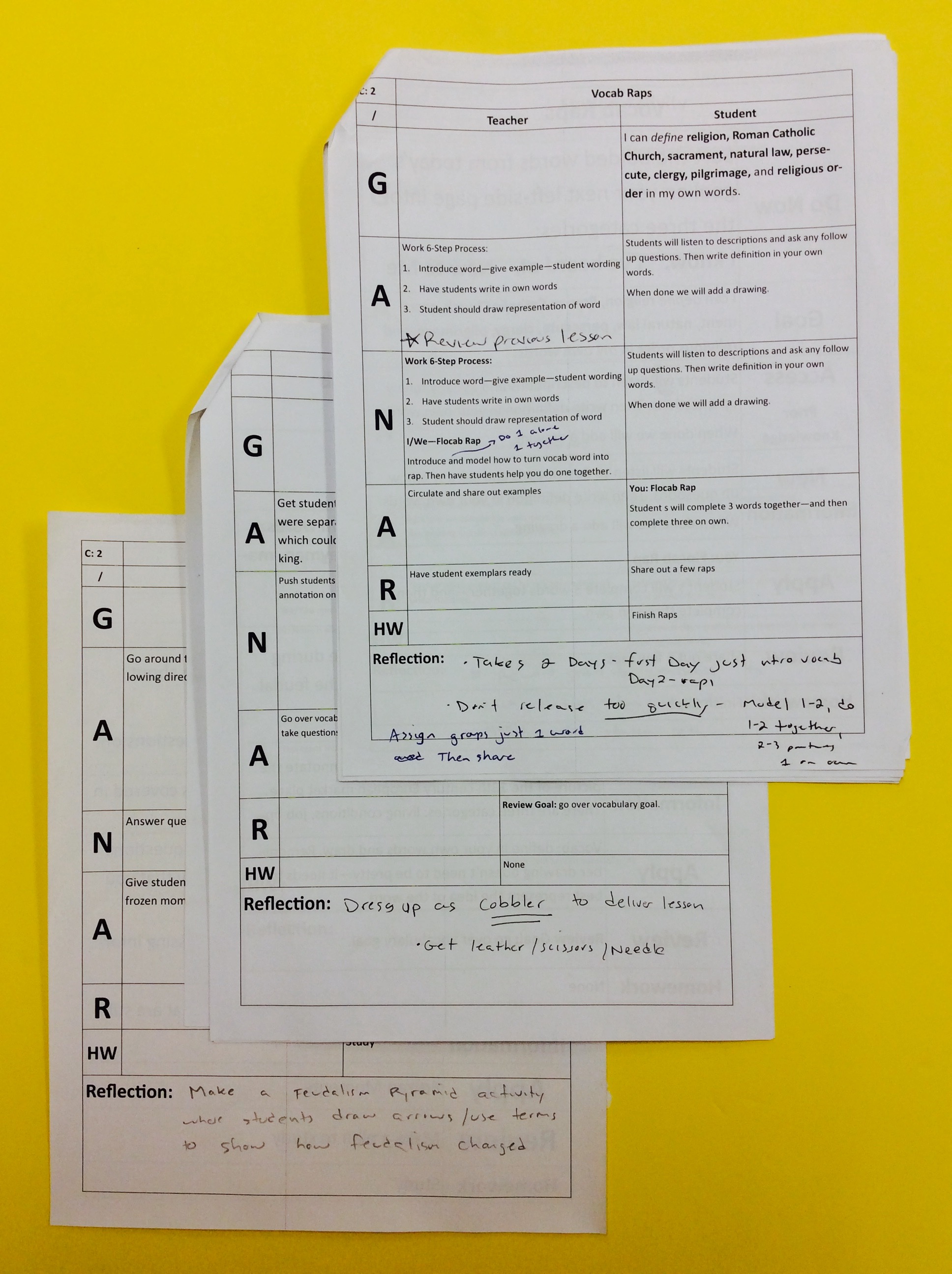 This year I began adding a blank Reflection section at the bottom of each of my lesson plans. I still print my lesson plan to have them near by during a lesson in order to stay organized and use planned questions or prompts. At the end of each lesson I then have a space to write down my reflections of the lesson. This is a generative process. I look back on my lesson to see what I will do differently in the future. Sometimes the reflections are specific to a particular lesson, like adding extra time to a think-pair-share activity or to reword directions of an assignment. Other times I draw larger conclusions that apply to the unit or my teaching in general, like to incorporate more cold call discussions or design a tracking system for which students I worked with during that particular day. This helps my lessons and my teaching to evolve and become more focused towards student learning.