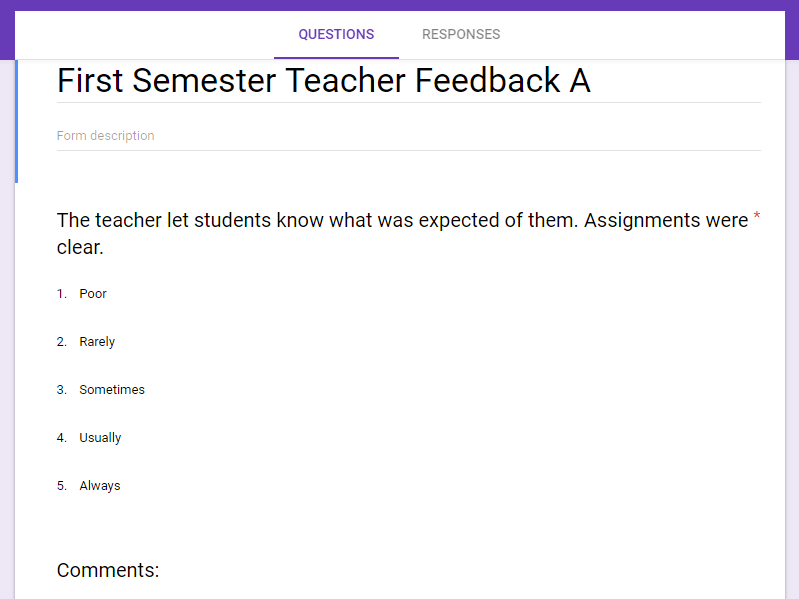 I have always been open and honest with my students, and I try my best to create a trusting relationship with them. This means at times pulling back the curtain on my teaching and showing them what I do and why I do it. It also means seeking out their opinions of lessons and activities, to get a feel of the class from their perspective. I do this informally by talking with small groups of students who happen to stay a little late or I discuss it with the entire class at the end of a unit or project. I also do it formally by creating student surveys. I use surveys at the end of certain units, especially when I am trying something new, and in the middle and end of the year as a general look back. What started out as paper and pencil feedback forms has turned digital with the use of Google Forms (here is an example
